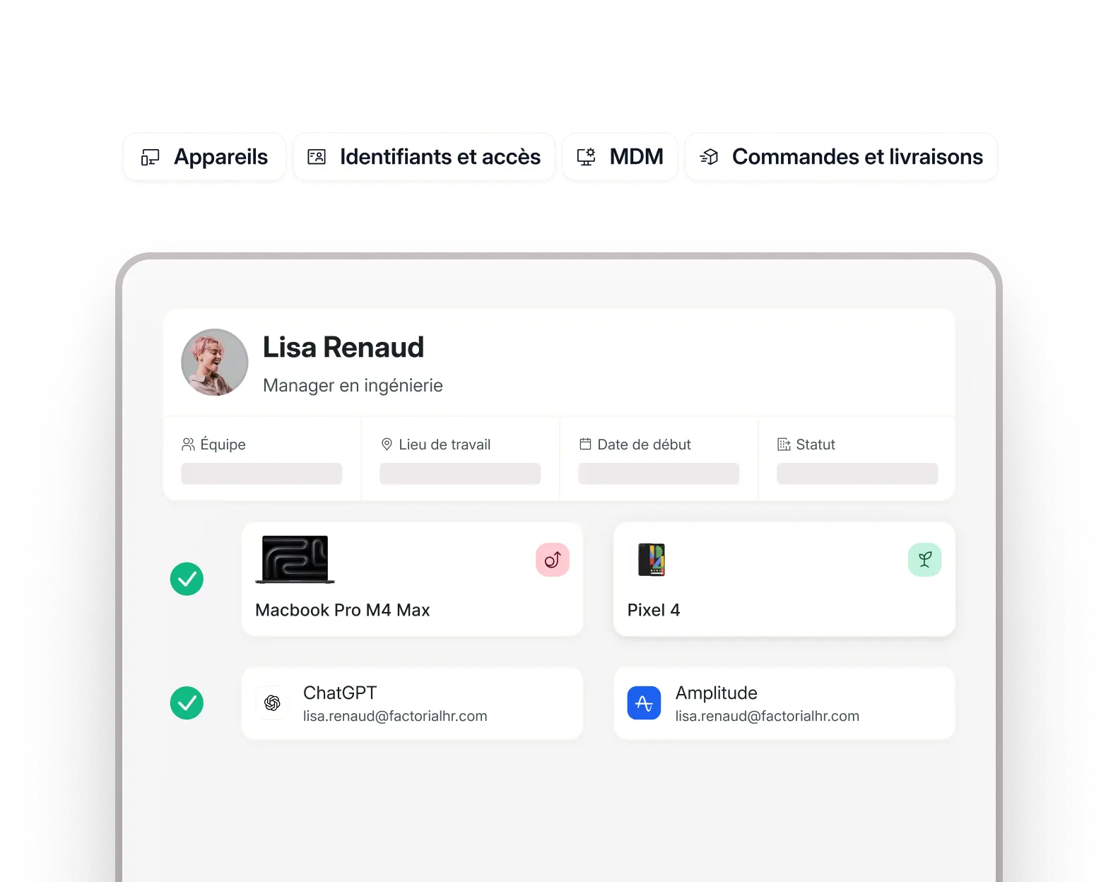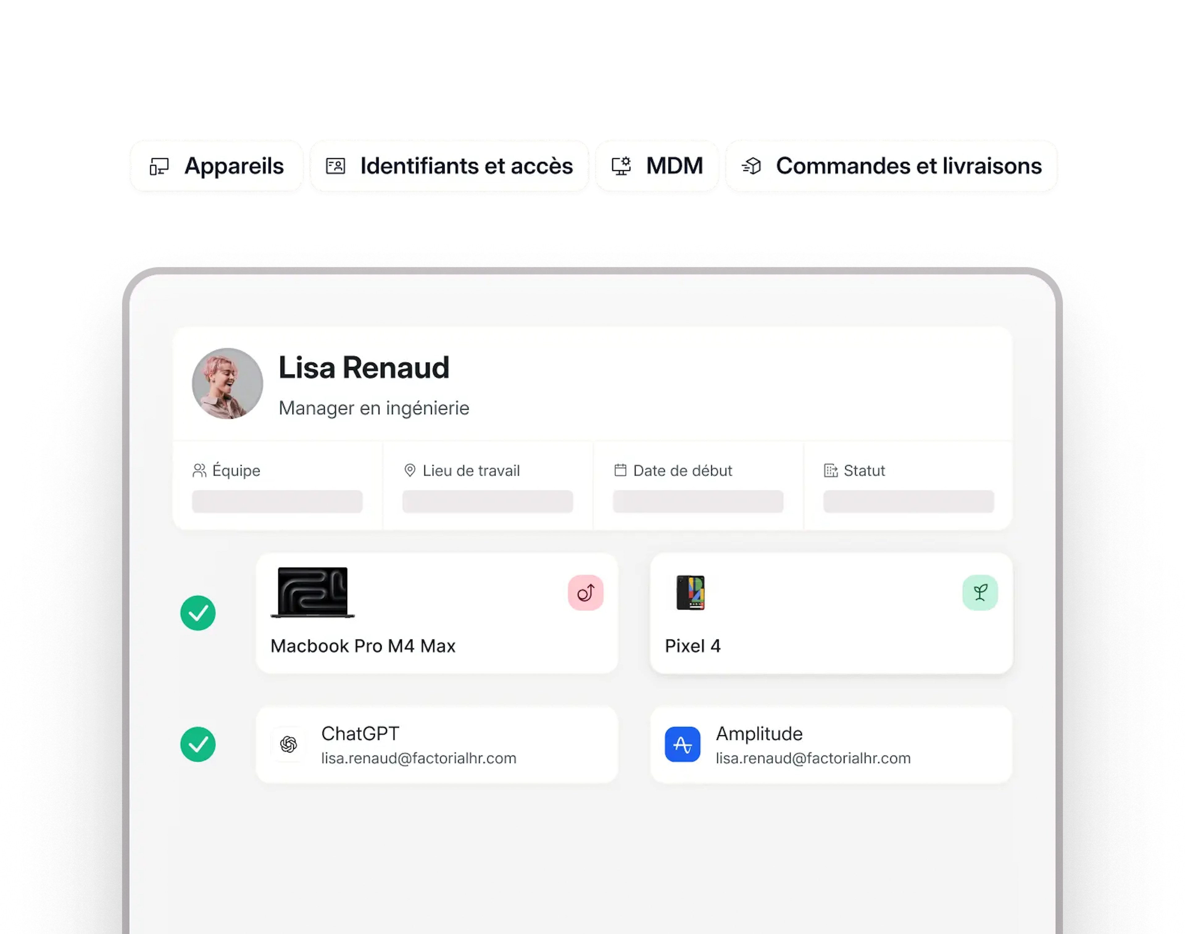 Factorial IT est connecté à Factorial Core. Les changements dans les données collaborateur déclenchent automatiquement des workflows IT comme l’affectation de matériel, l’accès aux outils SaaS ou les mises à jour de sécurité.