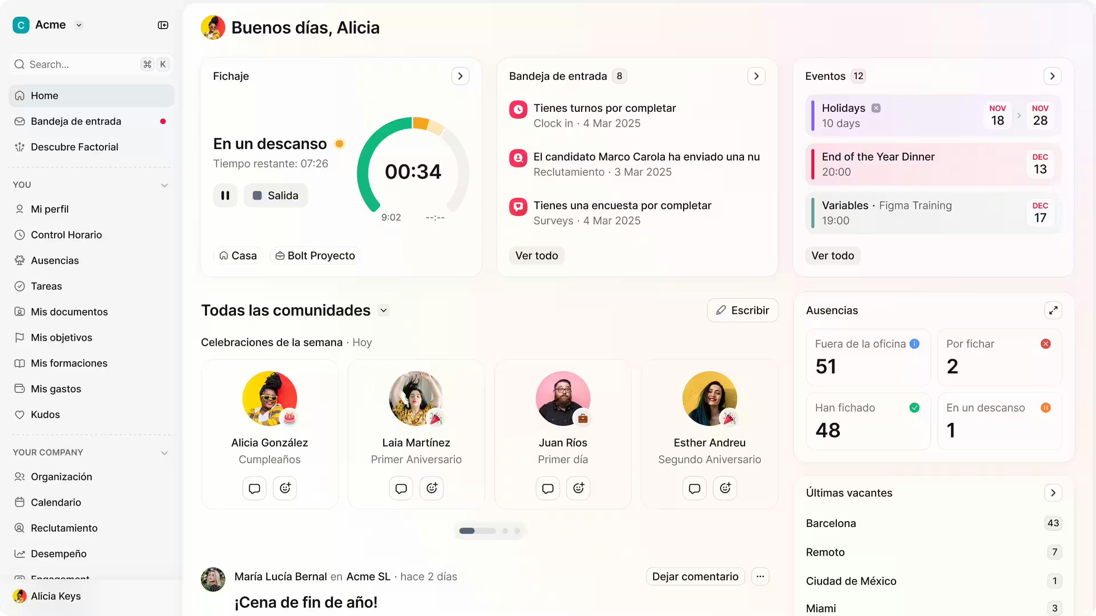 Faites un tour en autonomie du produit et découvrez comment Factorial automatise le suivi du temps, la planification des équipes, la gestion des absences et la paie