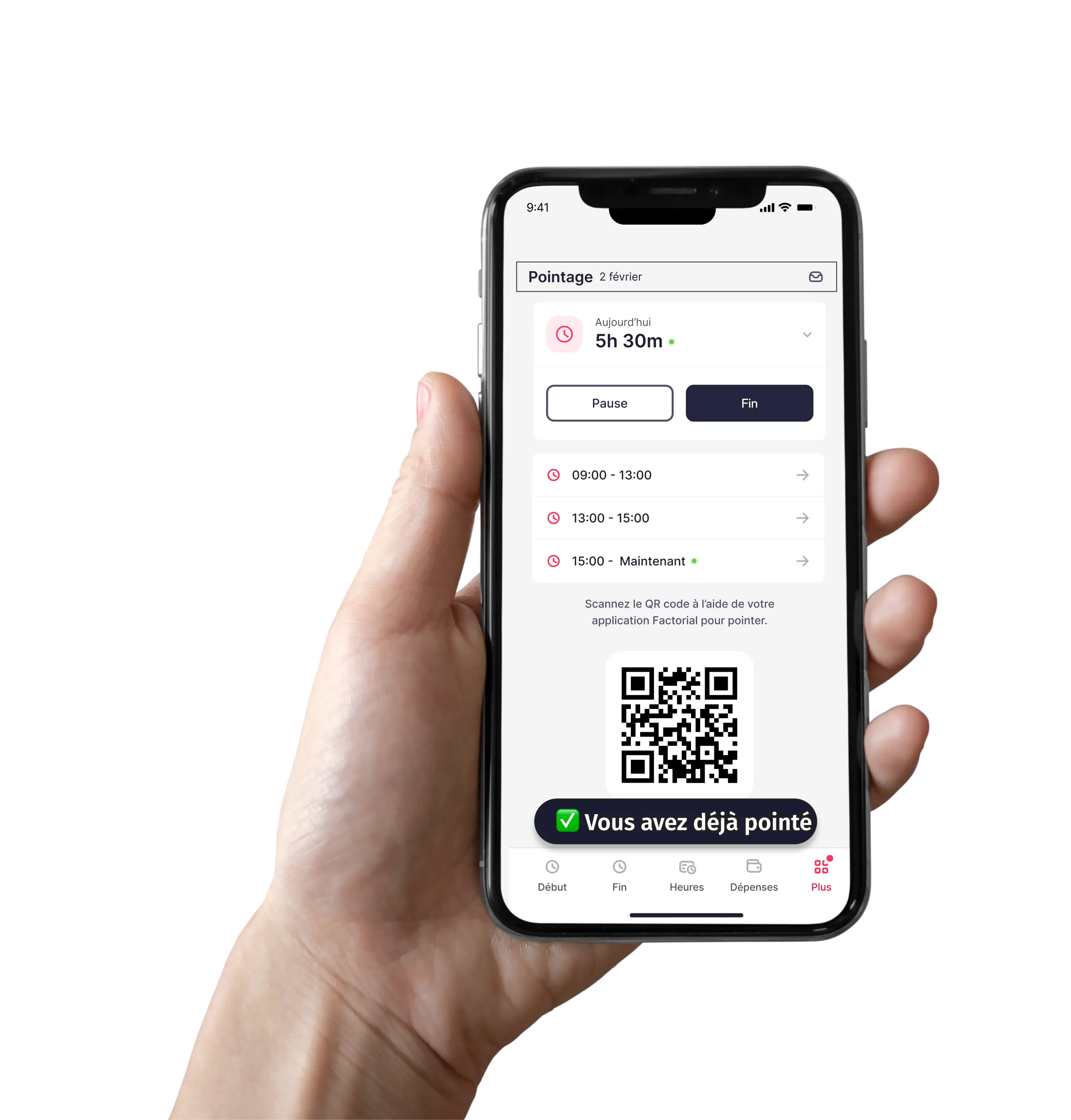 Vos collaborateurs pointent à l'arrivée et à la sortie, enregistrent leurs temps de pause depuis leur ordinateur, l'application de pointage mobile ou un QR code. Remplir sa feuille de temps est aussi simple que cela !