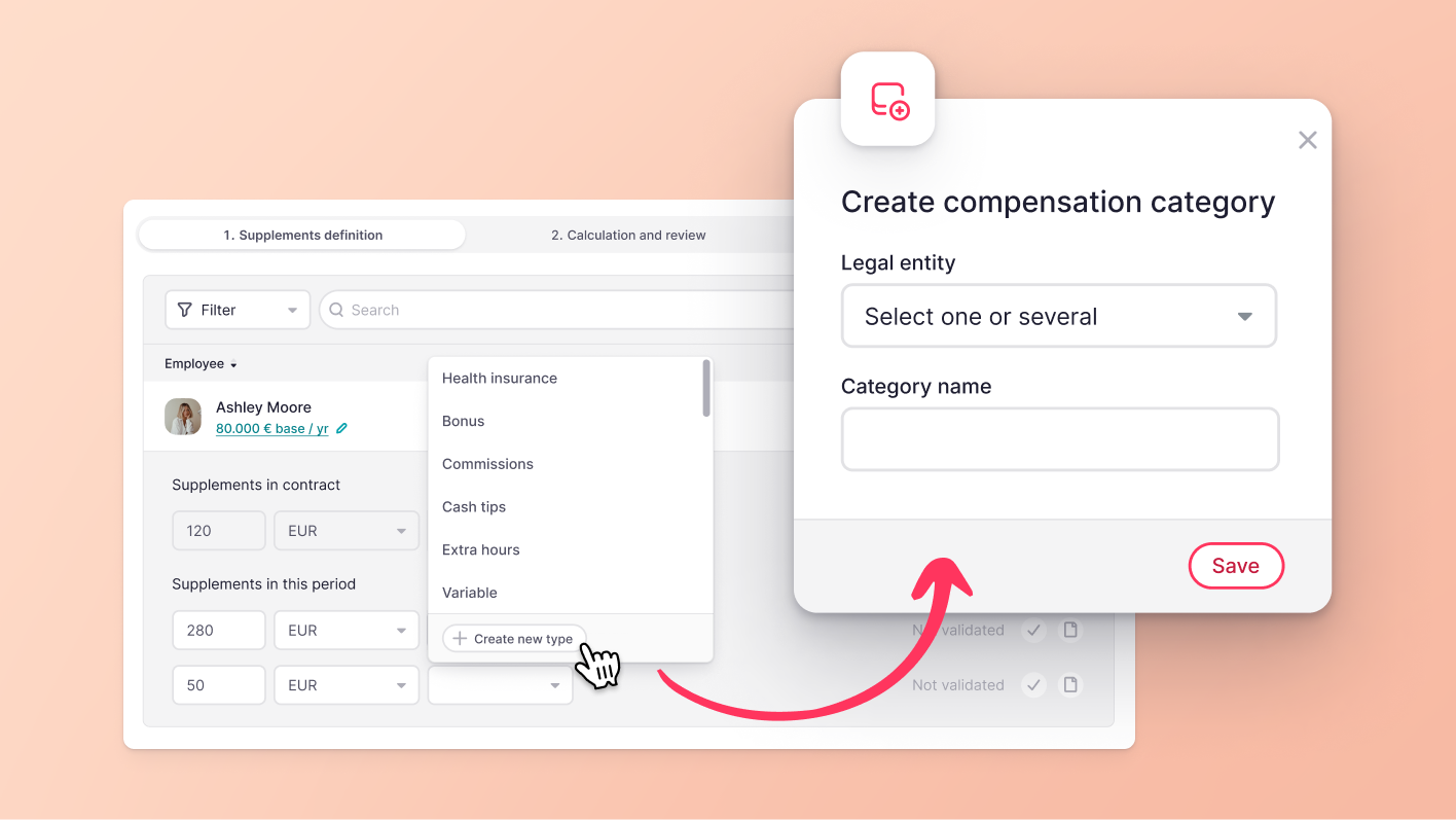 Auparavant, l'ajout d'un nouveau type de rémunération variable nécessitait de naviguer dans Paramètres > Détails de l'entreprise > Entité légale > Contrats > rémunération variable. Désormais, avec les permissions appropriées, vous pouvez créer de nouvelles catégories de rémunération directement depuis la section des suppléments du flux de travail de paie, précisément au moment où vous en avez besoin.
