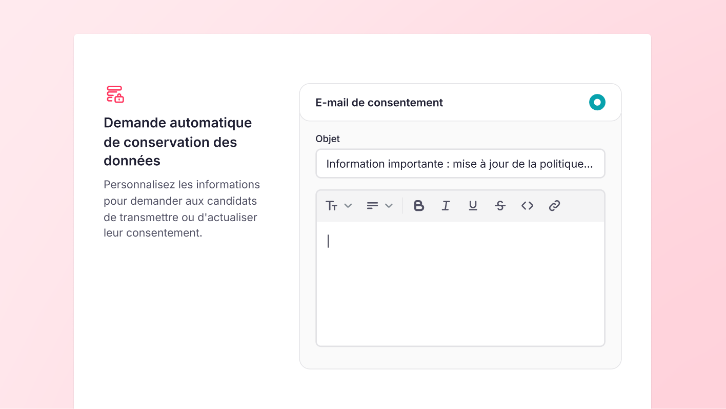 Restez conforme tout en préservant votre vivier de talents. Cette fonctionnalité automatise le renouvellement du consentement pour continuer à stocker légalement les informations des candidats.