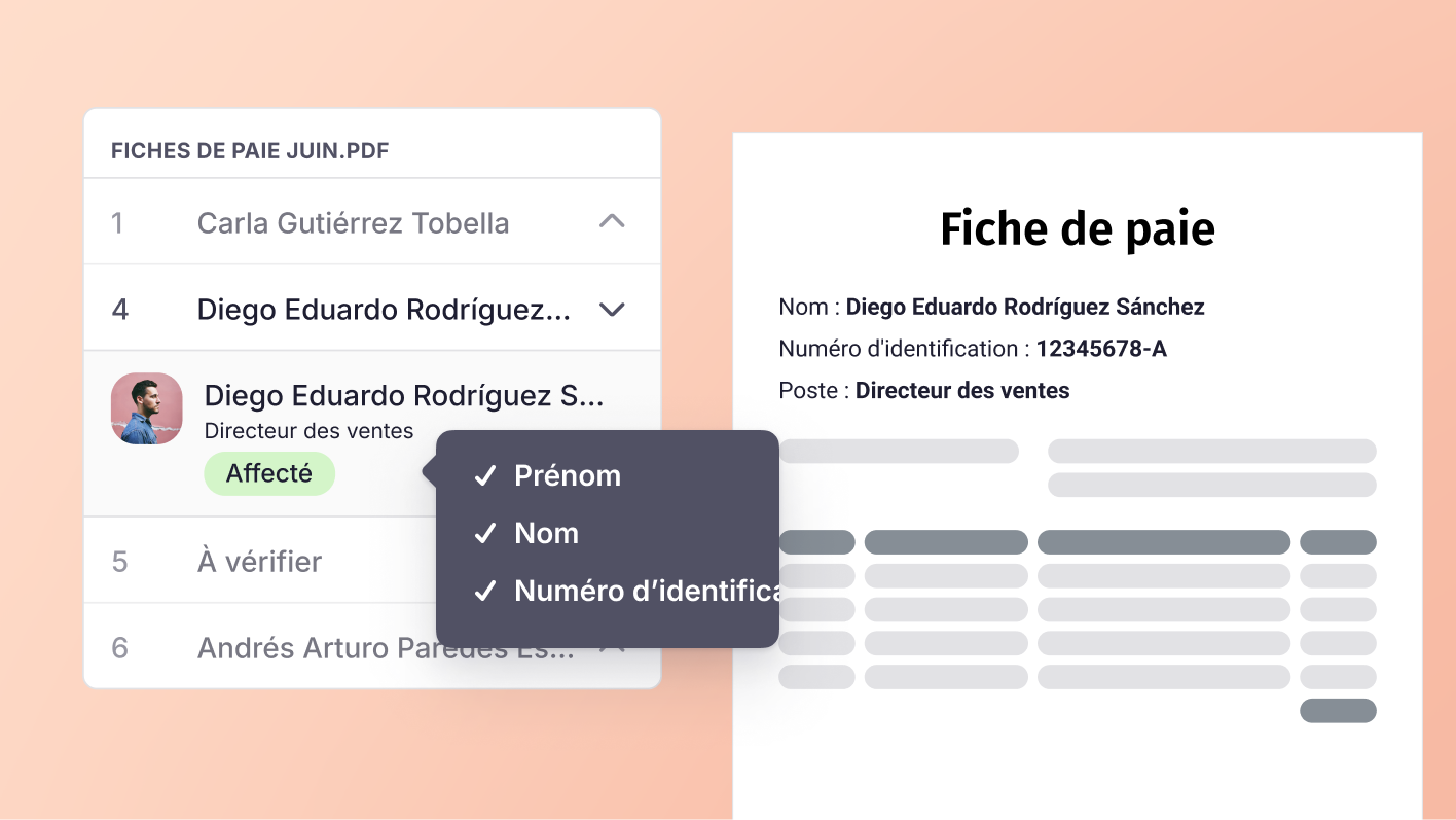 Simplifiez la distribution des fiches de paie en associant automatiquement chaque fiche de paie au bon collaborateur à l'aide d'identifiants clés (par exemple, le nom, le prénom, le numéro d'identification). Des assignations manuelles sont également disponibles si nécessaire.