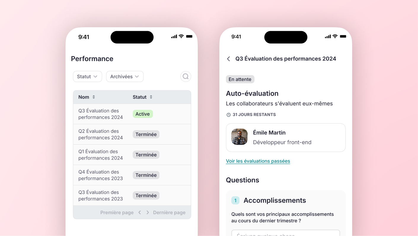 Restez au courant des évaluations des performances où que vous soyez. La nouvelle section Performance de l'application vous permet de :