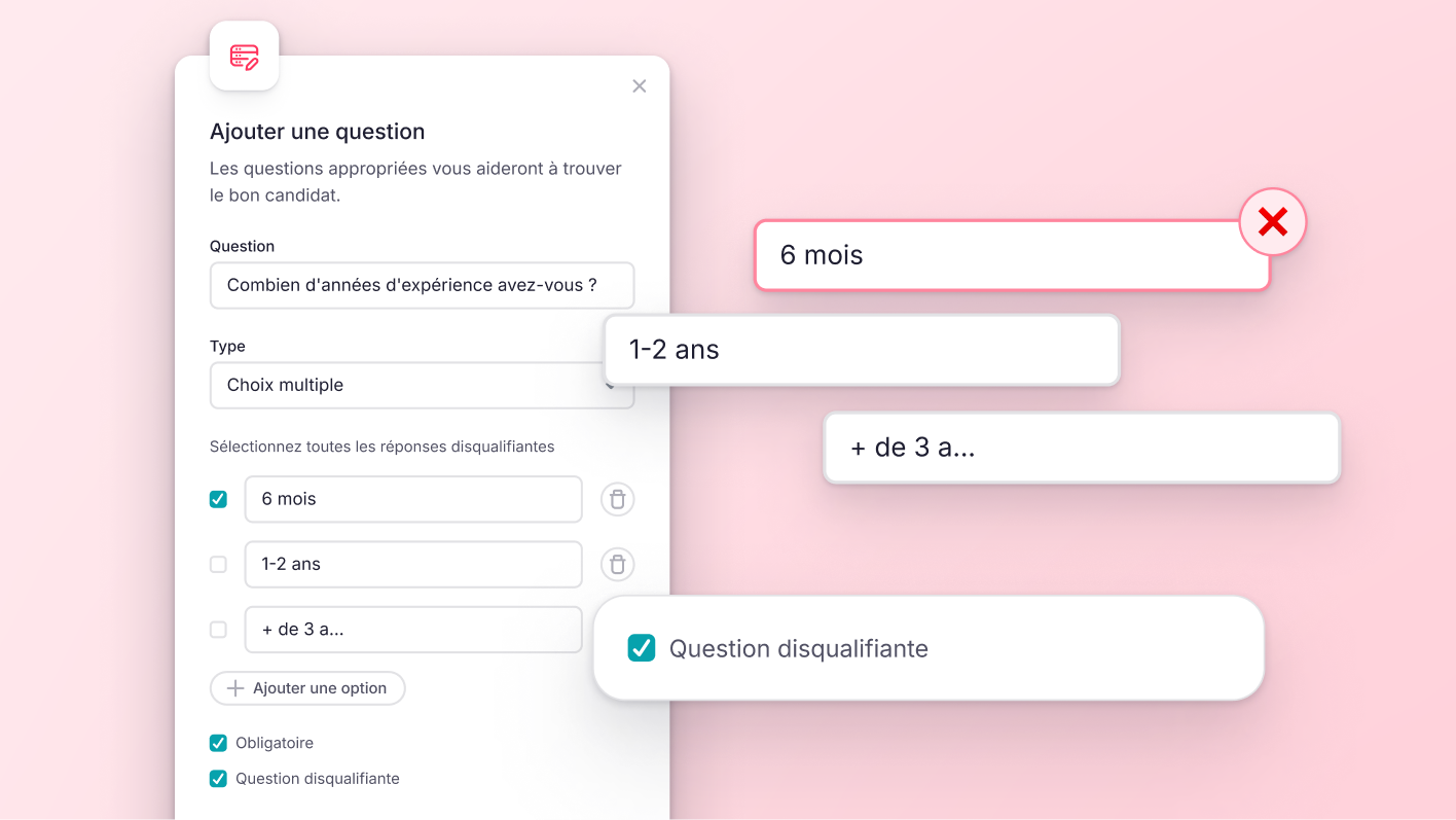Disqualifiez automatiquement les candidats en fonction de réponses spécifiques dans les offres d'emploi. Les managers peuvent définir des réponses éliminatoires pour les questions à choix multiples et à choix unique, simplifiant ainsi l'ensemble du processus d’embauche.
